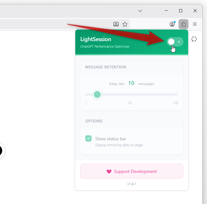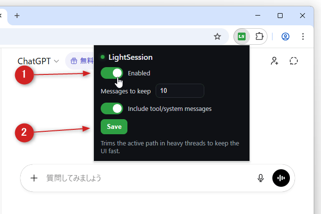 - 過去のメッセージすべてを表示させたい時は、ツールバー上の拡張機能ボタンをクリック →「ChatGPT LightSession(LightSession for ChatGPT)」をクリックし、上部のスイッチを OFF にします。