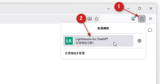 LightSession for ChatGPT の場合- ツールバー上の拡張機能ボタンをクリックし、「LightSession for ChatGPT」を選択します。