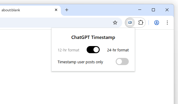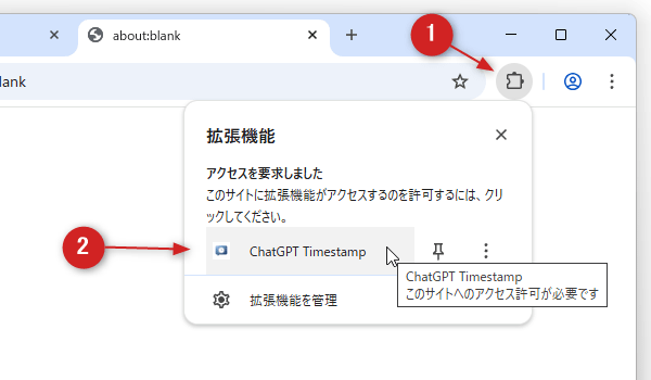 ツールバー上の拡張機能ボタンをクリック →「ChatGPT Timestamp」をクリックする