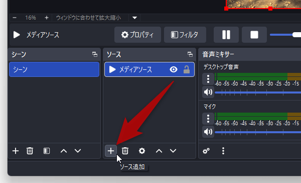 出力された MP4 動画を、「OBS Studio」で「メディアソース」として読み込む