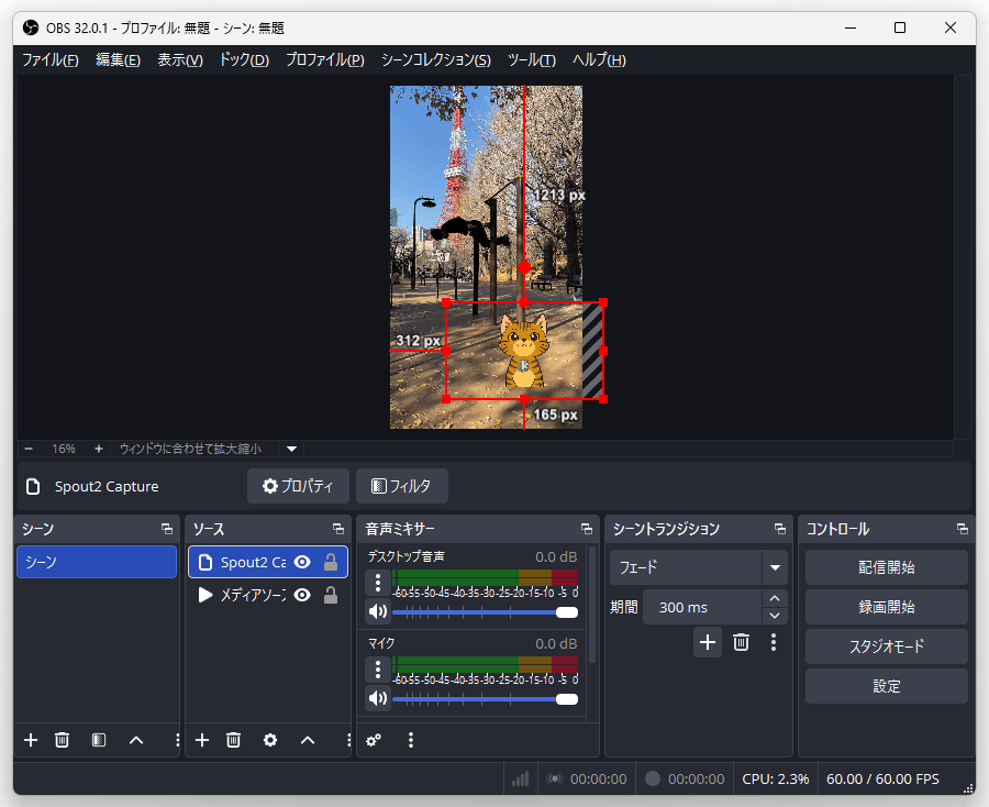 メディアソースの上に、「veadotube mini」で作成した k本的キャット君を合成する